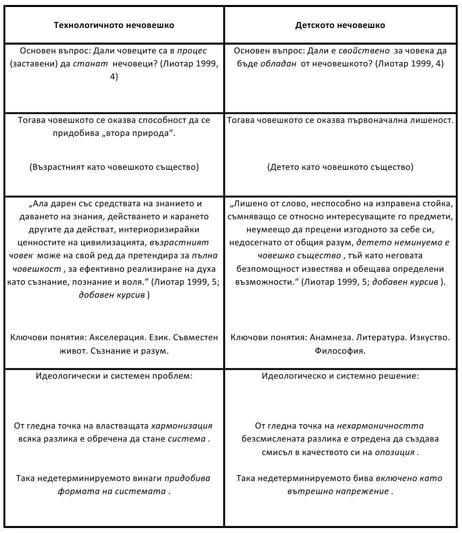 Двата модуса на нечовешкото, за които говори Лиотар, се противопоставят един на друг: технологичното нечовешко и детското нечовешко. Но се вижда, че технологичното опитва да включи другото, да го възпита, да го овладее без остатък. Именно включването е това, което трябва да бъде анализирано и разобличено според Лиотар, защото той настоява на нехармонизируемостта. Напрежението между двете нечовешкости се усилва от съвременната постмодерна трансформация: „един процес на усложняване, на отрицателна ентропия или по-скоро – на развитие“ (Лиотар 1999, 7). С този производствен дискурс метафизиката се завръща и възстановява своята тиха и невидима власт над самото мислене. Но не в него, а извън него – така тя е забранена територия за мисленето; т.е., това е неконтролируема идеология (не толкова система от идеи, колкото „способност за реализация“). Именно срещу този нов идеологически органон се бори Лиотар.
